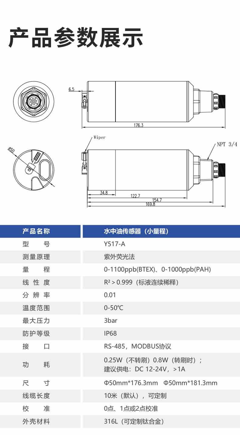 禹山传感生产的Y517-A水中油在线传感器是专业为测量水中的油浓度而设计,采用紫外荧光法测量水中油分子的浓度。原理基于 PAH 的荧光特性。由紫外光源引起激发后,PAH 会在短时间延迟后发射波长较长的光。测量此光的强度,它与 PAH 的浓度成正比。此测量原理比吸收和散射光测量要灵敏得多。pah测试甚至可以检测出水中轻微的 PAH 污染痕迹。PAH 是大多数矿物油产品的组成部分,是指示水体和工艺水中油污染的一个非常具体的指标。