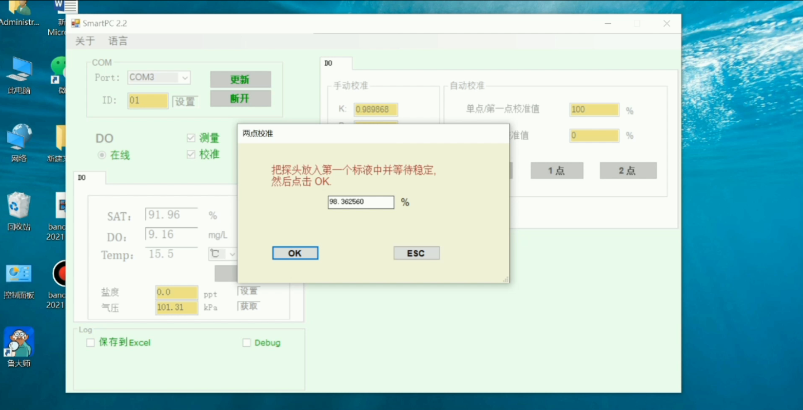 从零氧中拿出传感器,用纸巾擦拭传感器测量端面,将传感器放入 100% 环境中(空气中),读取溶解氧的数值,等待数据趋于稳定,数值接近 1(即 饱和度 100%),将数值记录为 Y。