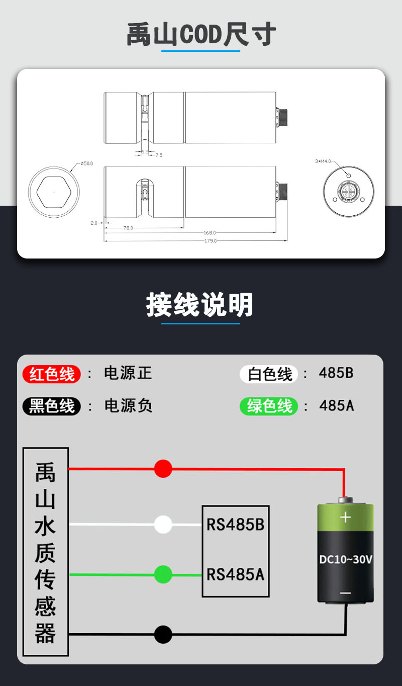禹山双光法cod传感器是一款基于双波长方式测量水质中COD浓度的智能数字式分析设备,采用长距离传输的RS485通讯接口和标准Modbus协议,易于系统集成。整体结构具有IP68防护等级,可长期工作于水下30米深度以及各种恶劣的工作环境。携带自动清洁电刷,免人工维护。配套有专业的数据采集软件,可实时监控传感器的工作状态、测量结果,同时可方便地进行标定、记录、故障诊断等操作。COD传感器基于双波长方式检测技术,具有精度高、稳定性好、抗干扰强、响应速度快、无需预处理、免维护等优点。广泛应用于地表水、河流断面、湖泊水库、市政污水、污水处理、海水监测等。